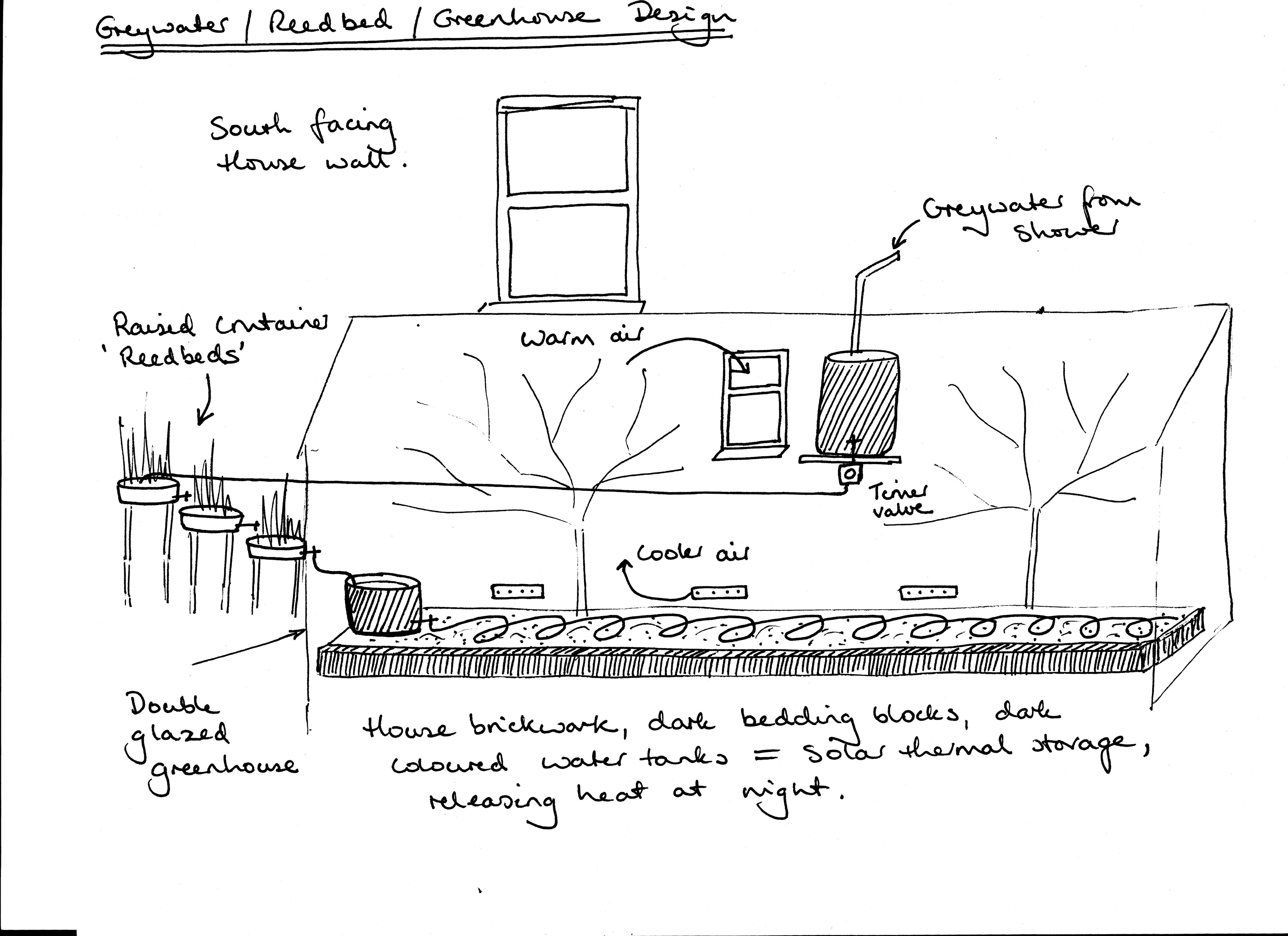 Solar Gain Greenhouse with Grey Water Thermal Store and Reed Bed System