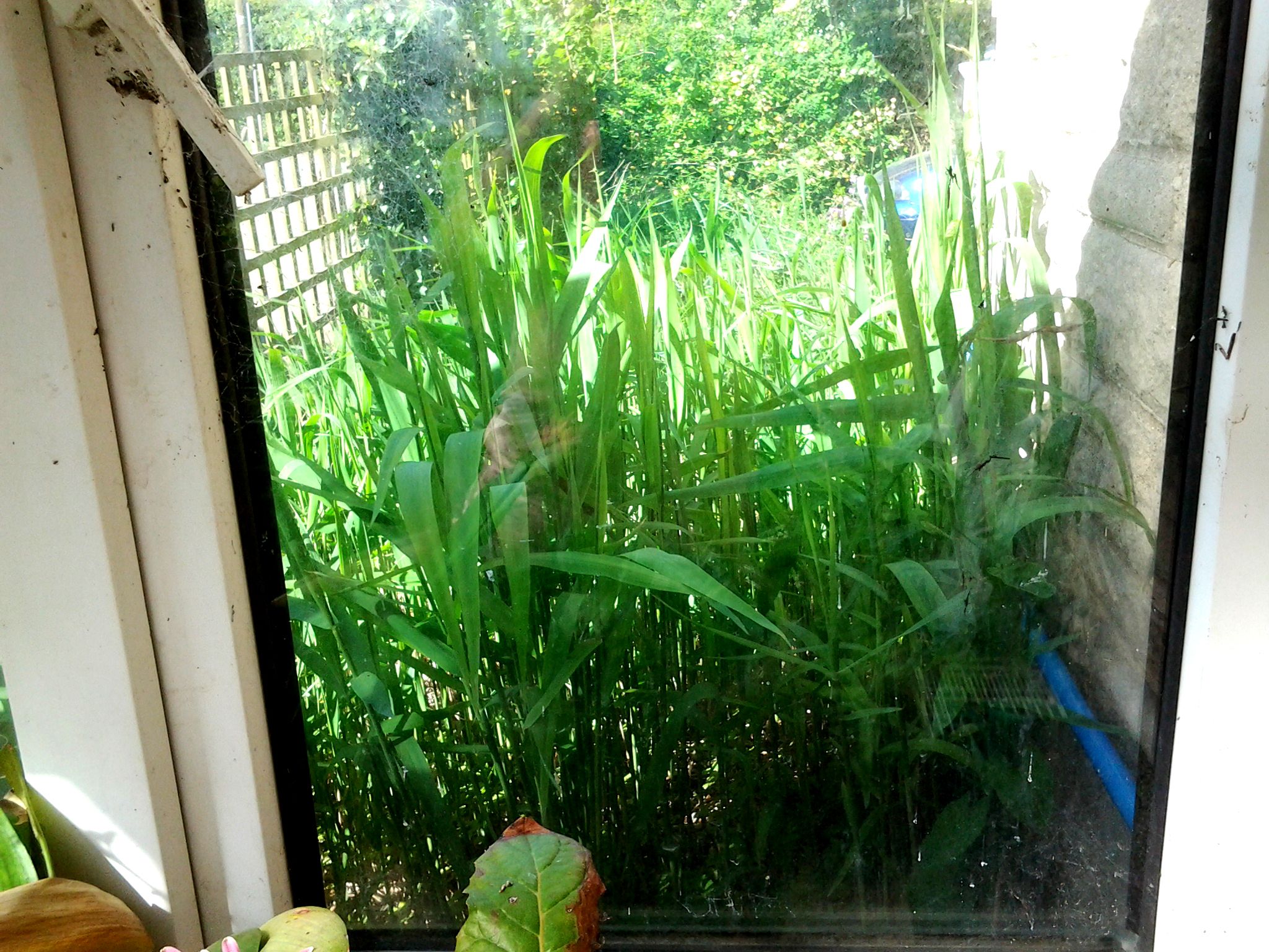 The reed bed viewed through the greenhouse. The reed bed cleans our grey water and creates an abundant biotope for wildlife.